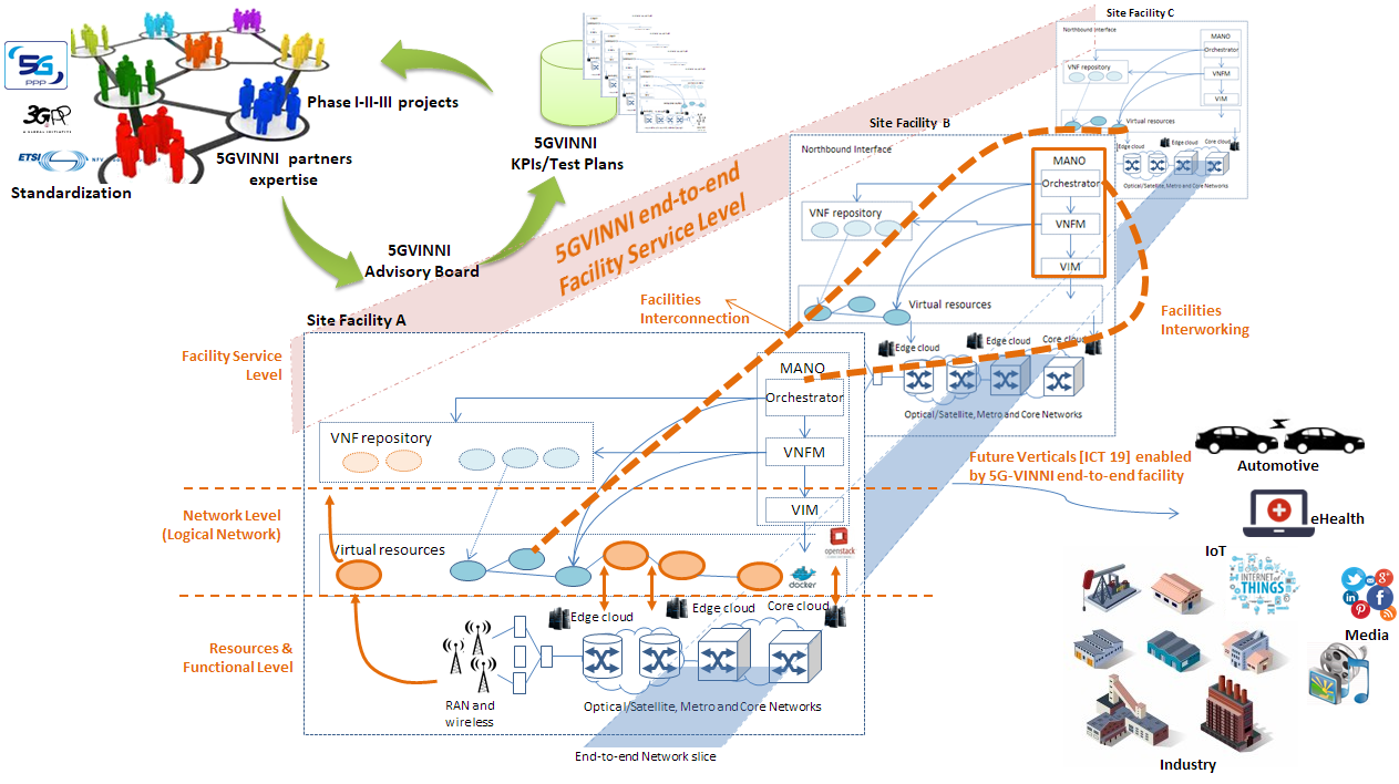 The 5G-VINNI concept is to develop an (E2E 5G facility that can be used to first demonstrate the practical implementation of infrastructure to support the key 5G KPIs, and then to allow vertical industries to test and validate specific applications that are dependent upon those KPIs. However, 5G-VINNI is not intended to be simply a group of interconnected test facility sites – it is underpinned by principles that will allow for highly dynamic and flexible network architectures, service deployment and testing, that will create new technical and commercial service deployment models. These will in turn drive inter-facility interconnection to enable virtualized functions from the network and service layer to be called upon from any facility, with complete location agnosticism – a truly cloud-based network instantiation that has no functional boundaries, implemented across multiple facility sites.