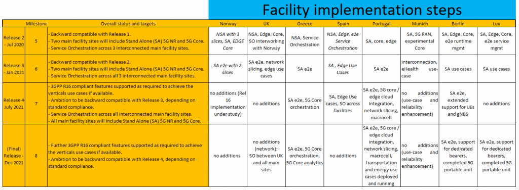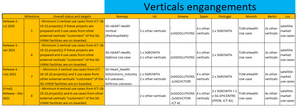 | Verticals engagement | – Demo with defense done. – 5GHeart : Fish farm and eHealth – 5GSol: Industry 4.0 and Smart Port_On track |