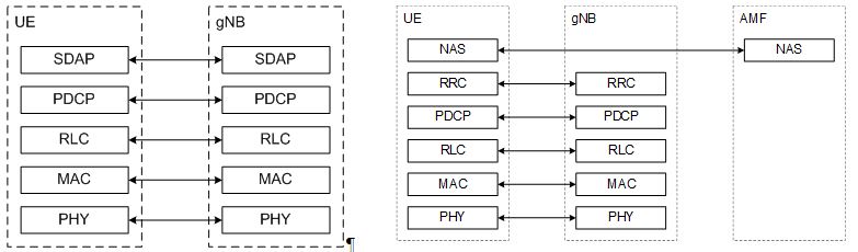 Figure 1: NR User Plane Protocol Stack (left) and Control Plane Stack (right) [4]