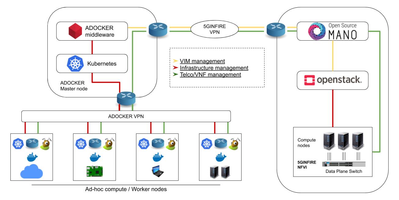 ADOCKER is a platform that allow experimenters to set up their own testbed for experimenting on 5GINFIRE. This new platform is based on a Kubernetes cluster and is able to be deployed automatically. It uses two types of nodes: the workers, where the VNFs are deployed, and the master which manages the infrastructure and connects it to the 5GINFIRe platform. The master node is permanent, while any number of worker nodes can be added from remote places and deleted once they are no longer needed. All of this is done automatically and no tedious work or deep knowledge is required from the experimenters. The integration with the OSM is guaranteed by the ADOCKER middleware and the VIM plugin.