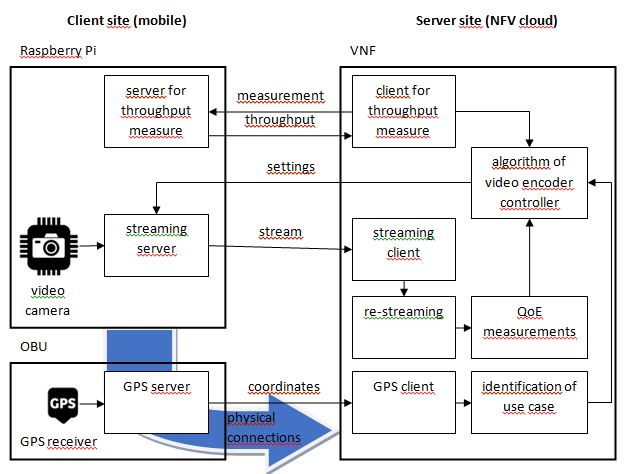 Tests of the developed system that is able to control the video streaming on the basis of measured QoS and QoE parameters were divided into a few stages in order to minimize risks of errors in the developed software. The system was implemented in a client-server model. VNF based on a VM of Ubuntu Linux was deployed using 5GINFIRE Portal and it acted as a server site that manages the control process in a feedback loop between the server and client. The client site was designed and developed for a Raspberry Pi board equipped with a video camera. The Raspberry Pi board used the OBU device to communicate with the core network via available wireless interfaces. Moreover the OBU device provided geographic coordinates from a GPS receiver built in it.