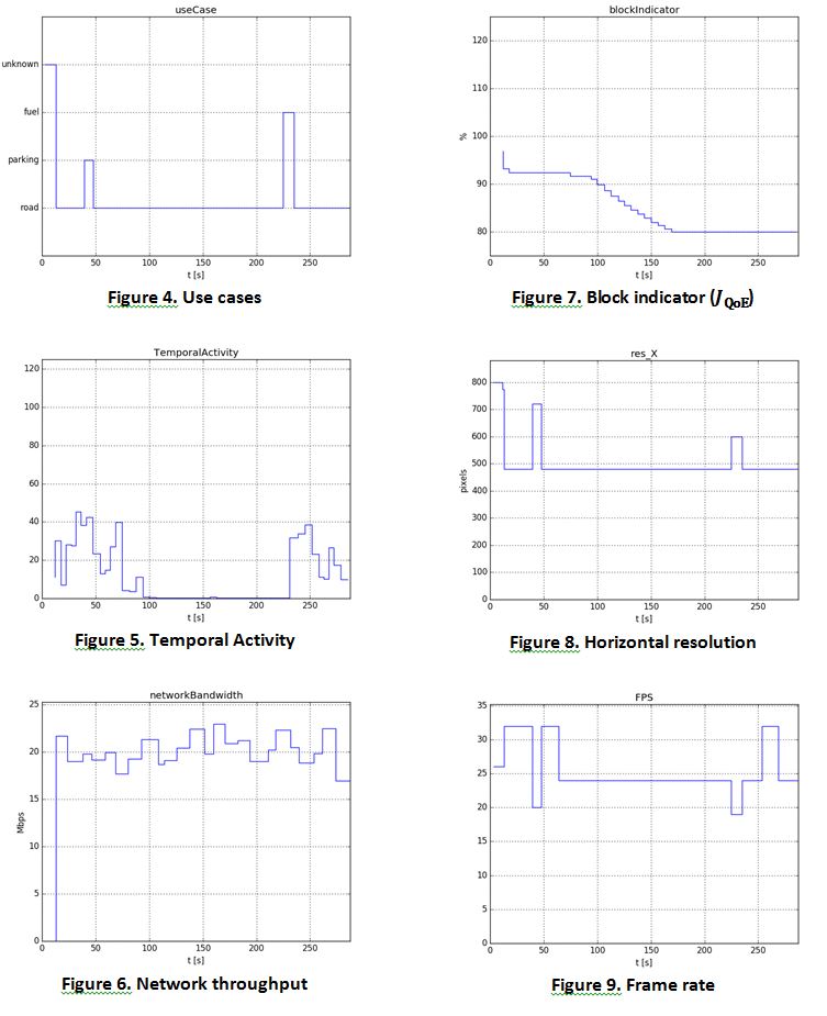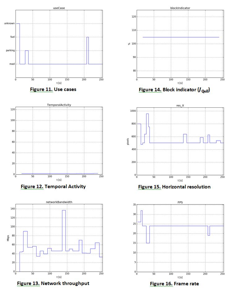 Positioning data (1) allowed identifying the use case. In these field tests there were two use cases – road and parking, or ‘unknown’ location could be identified (Figure 18). The information about throughput (2) was sent from RPi to VNF. The video stream received by the server was analyzed to evaluate a set of QoE parameters using a dedicated software [3]. All these data were used to tune parameters of the video encoder.