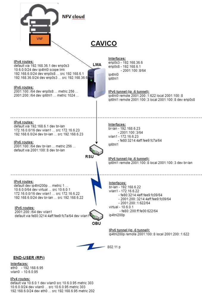 The network infrastructure in Aveiro that was used for CAVICO project is presented in Figure 2. CAVICO client software was installed in the RPi board. It communicates with OBU via IEEE 802.11p interface. The OBU device provides access to the core network via WLAN access. This wireless transmission was handled by RSU. Routing and authentication between the network infrastructure in Aveiro and the remaining network resources including the NFV cloud were managed by the LMA gateway.
