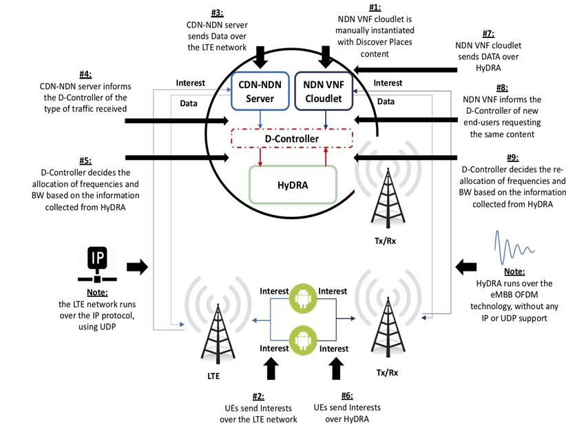 In the DIRECTOR 5G architecture, NDN runs as an overlay on top of IP where available, and natively across the HyDRA sliced 5G enhanced Mobile Broadband (eMBB) Orthogonal Frequency-Division Multiplexing (OFDM) radio access technology when not.