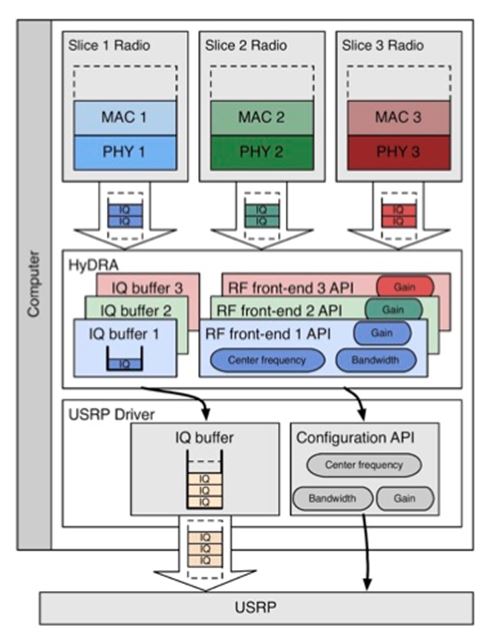 HyDRA is a Software Defined Radio (SDR) virtualization framework that supports the execution of multiple programmable air-interfaces on top of a single Radio Front-end (RF). For ease of understanding, Figure 2 illustrates the internal architecture components of HyDRA. It is a flexible tool that enables Remote Radio Head (RRH) slicing, multi-radio access networks, and multi-tenant networks. The primary objective of HyDRA is to provide a malleable and adaptable RF capable of offering different Radio Access Technologies (RAT) based on the vastly different requirements of end-users and applications in 5G environments.