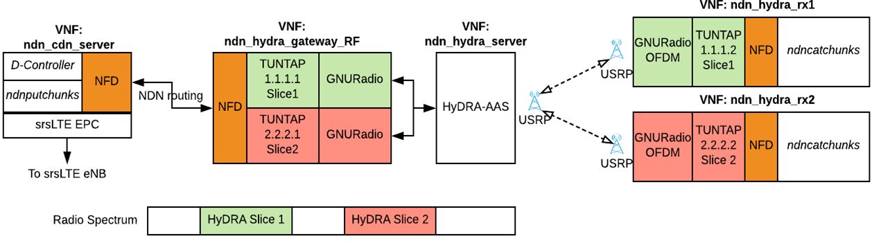 The DIRECTOR 5G project was conceived to investigate and to further improve the Quality-of-Experience (QoE) of end-users in 5G wireless network environments by utilising the Named Data Networking (NDN) architecture and the HyDRA radio slicing technology. For the purpose of this project, a number of Virtual Network Functions (VNFs) have been developed to support the propagation of NDN content requests (Interests) and replies (Data) over the Orthogonal Frequency-Division Multiplexing (OFDM) radio access technology using virtualized HyDRA radio slices and the 4G Long-Term Evolution (LTE) technology. These functions are supported by the operation of an NDN Content Delivery Server (NDN-CDN) server, an NDN cache cloudlet, and a control process called D-Controller developed to support the orchestration and control of SDR parameters and radio slices within 5G wireless network environments based on end-user demand. The project was evaluated in the context of the WINS_5G testbed at Trinity College Dublin, exploiting the testbed’s software defined radio infrastructure.