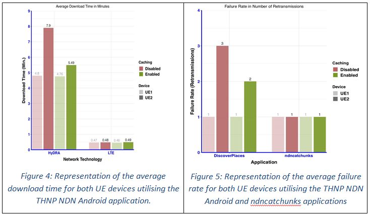 Furthermore, according to the results concluded with regard to the failure rate metric presented in Figure 5, HyDRA has a considerable number of interruptions and/or packet loss over the HyDRA OFDM wireless slice links. However, UEs are able to overcome the interruptions and/or packet loss issues experienced on the HyDRA radio slicing framework by simply utilising the NDN architecture to automatically retransmit Interests for lost or corrupted data objects. This is the major benefit of the NDN architecture and the third objective we set out to observe during the DIRECTOR 5G experiments.