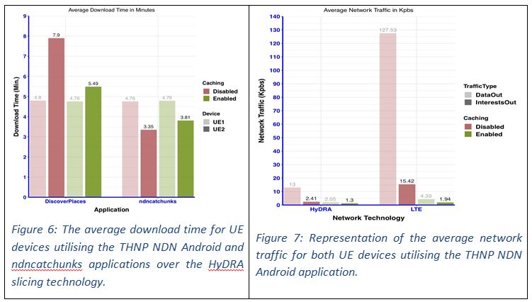 Figure 6 illustrates the average download time for both UE device experiments:1) utilising the THNP NDN Android application with Android handset, and 2)using the ndncatchunks application/tool with UE VNF connected to N210 USRPs. The figure has been generated to allow the comparison of the average download time experienced by the UEs with regard to the applications (NDN Android or ndncatchunks) and the identification of any differences between the different experiments. The results show that the average download time for the UEs when the average failure rate between the applications is equal, has been shown to remain equivalent. This is a rather interesting outcome, as it indicates that the USRP equipment used to connect the Android UEs to the HyDRA slicing technology, are able to perform the operations of modulation and demodulation of an OFDM radio signal without introducing a noticeable delay that may affect the average download time experienced by the UEs.