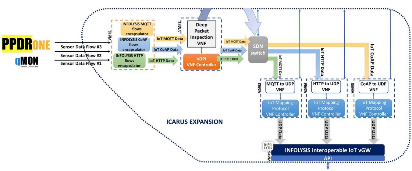 It must be noted that for the execution of the ICARUS experiment, INFOLYSiS relies on the use of the PPDR ONE infrastructure, while the inclusion of the qMON network sensors mainly for the IoT data provision is expected. These data communicated and then, in order to create conditions of non-interoperability, the data flows encapsulated to different IoT protocols (e.g. CoAP, MQTT, HTTP, etc.) through the INFOLYSiS encapsulator nodes, which will be deployed as VNFs at the PPDR-ONE infrastructure, in order to perform the ICARUS experiment with real data streams and different data protocols. The experimental methodology also includes the stressing of the vDPI and the mapping functions for different data rate values and traffic volumes.