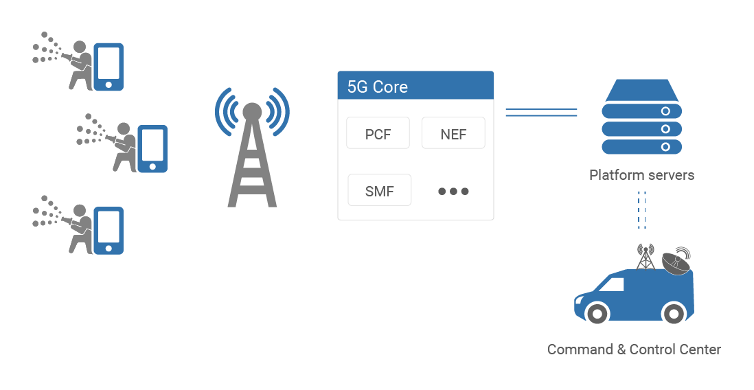 NEF is deployed in the 5G core to expose standardized APIs for other services, commonly referred as AFs in the 5G terminology. Platform servers, which support management of PPDR resources in mission critical services, act as an AF and request to NEF the appropriate QoS configurations for the different flows that are associated with the PPDR terminals (e.g. mobile phones), and this request is relayed to the Policy Control Function (PCF) via NEF. The PCF will then assess this request and perform the necessary steps in the Session Management Function (SMF) to re-configure the network. For instance, specific settings are requested for critical types of data, e.g. panic buttons and biosensors that must be prioritized for safety of PPDR personnel, or audio and video flows that must ensure low latency for a real-time full situational awareness picture.