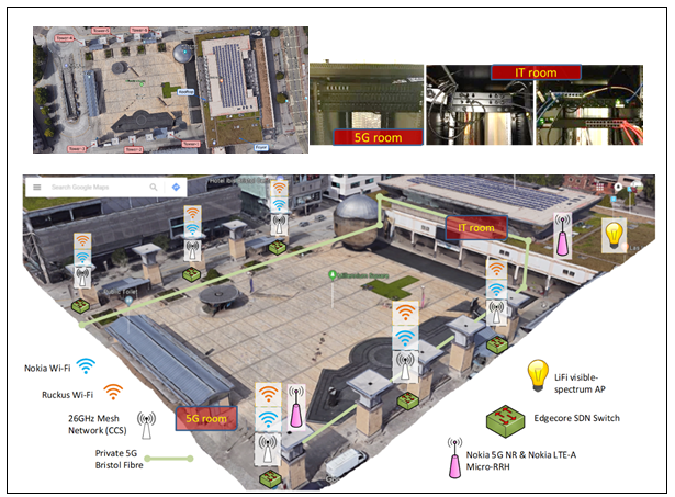 The University of Bristol’s 5G testbed is a multi-site network connected through a 10km fibre with several active switching nodes, that are depicted in Figure 2. The core network is located at the High-Performance Network (HPN) laboratory at the University of Bristol and an extra edge computing node is available in another central location, known as Watershed. As shown in Figure 1, the access technologies are located in two different areas in the city centre: Millennium Square for outdoor coverage and “We The Curious” science museum for indoor coverage.