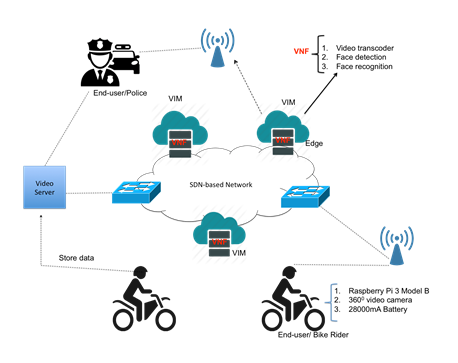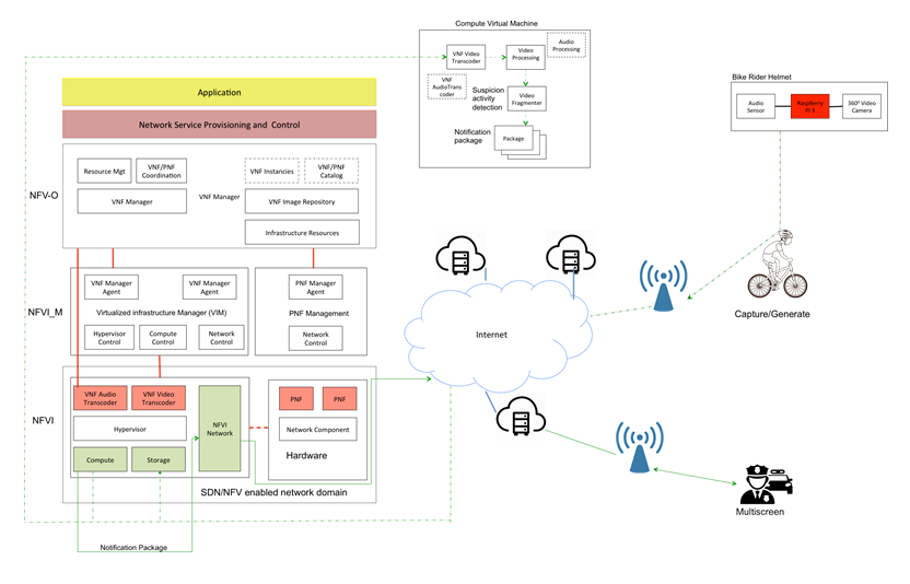 Figure 4 shows a high level architecture of the smart city safety use case. The bike rider carries his helmet, which has attached the Raspberry PI and the 360-degree camera. Along of his path video and audio is capturing and send via WiFi to the Mobile Edge Computing (MEC) or Cloud to be processed. Once the audio and video has been processed and any suspicious activity has been detected a notification is generated and sent to the different security agents.