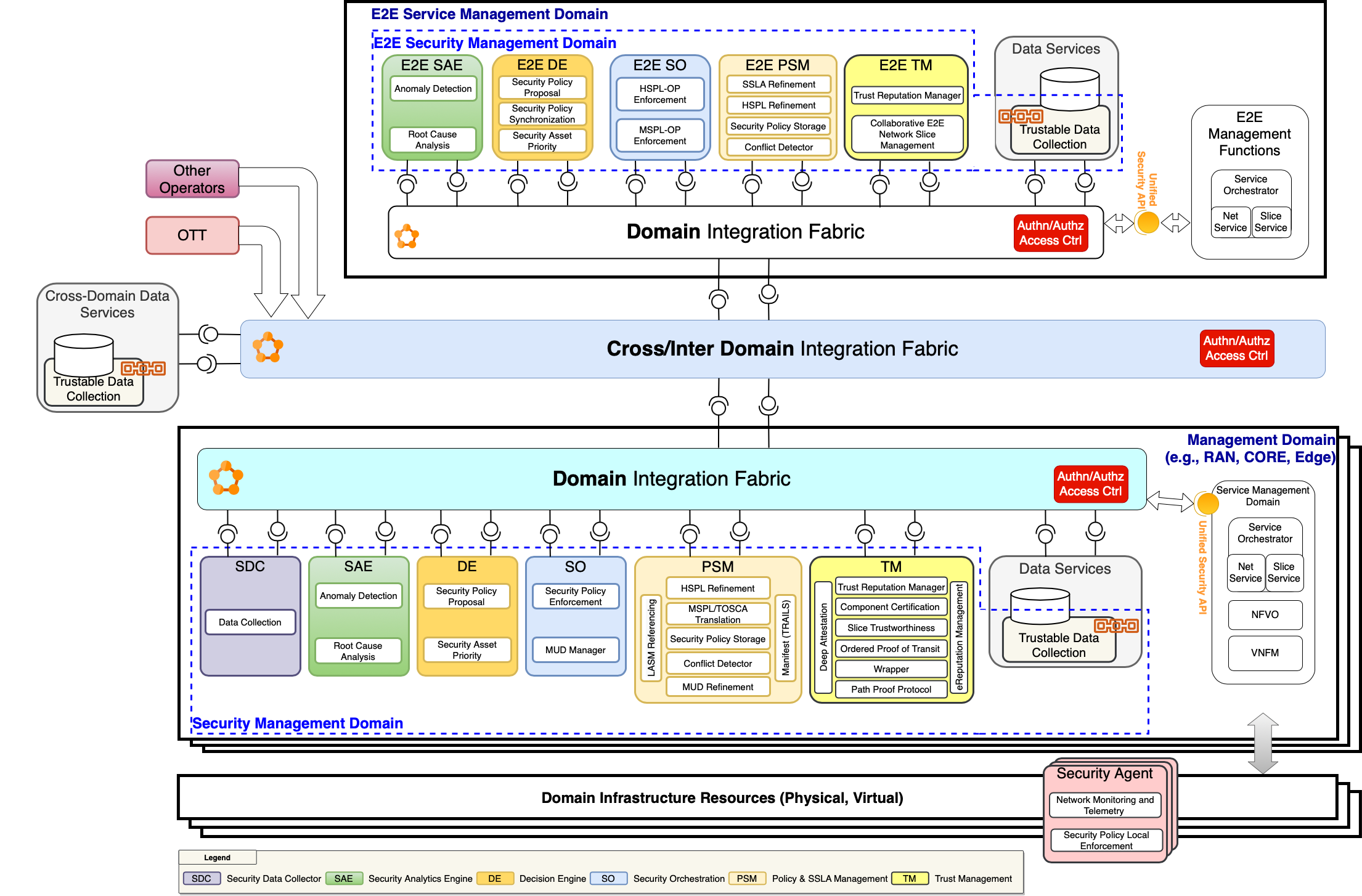 INSPIRE-5Gplus framework is devised to support fully automated E2E network and service security management in 5G environments across multiple technological domains (e.g., RAN, CN, and MEC) owned by the same legal entity. The framework enables not only protection but also trustworthiness and liability in managing virtualized network infrastructures across multi-domains.