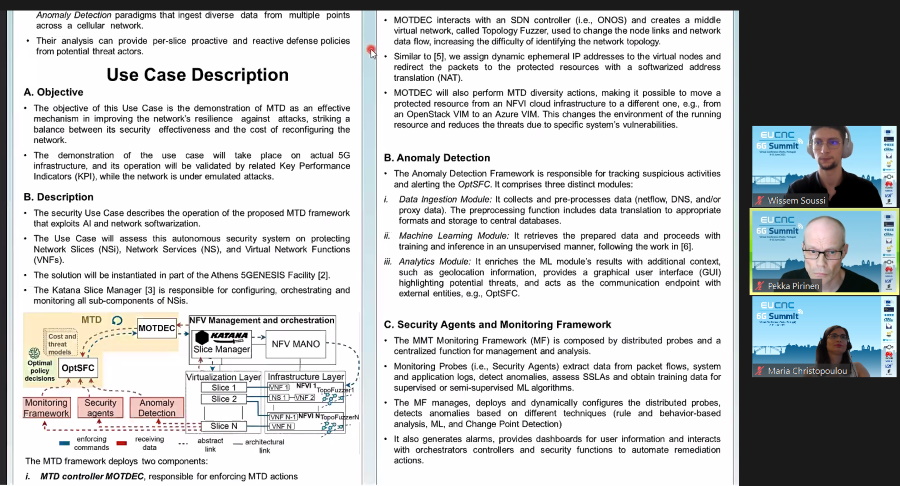 At the 2021 Joint EuCNC & 6G Summit, INSPIRE-5Gplus partners National Centre for Scientific Research Demokritos (NCSRD) and Zurich University of Applied Sciences (ZHAW) made a virtual presentation on “AI-Enabled Slice Protection Exploiting Moving Target Defense in 6G Networks”. The INSPIRE-5Gplus paper describes a use case for the proactive and reactive defense of end-to-end network slices that relies on AI-based attack detection by applying Moving Target Defense (MTD) policies based on an innovative framework. The use case is part of ongoing collaborative work between INSPIRE-5Gplus partners ZHAW, NCSRD and Montimage (MI).