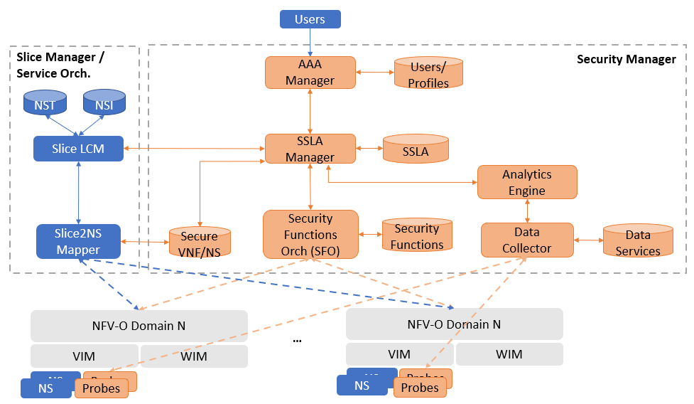 The paper explains how, once the E2E network slicing solution is deployed, it will be associated with one or more Security Service Level Agreements (SSLAs). This increases the security of the deployed virtual resources, and it enables creating E2E secure network slices. In addition to the architecture, the paper presents a simple network slicing deployment use case. It shows and describes the steps, in which each of the multiple modules in the architecture is involved: from the network slice request with the SSLA association to the complete deployment of the desired service and the related elements to monitor it.