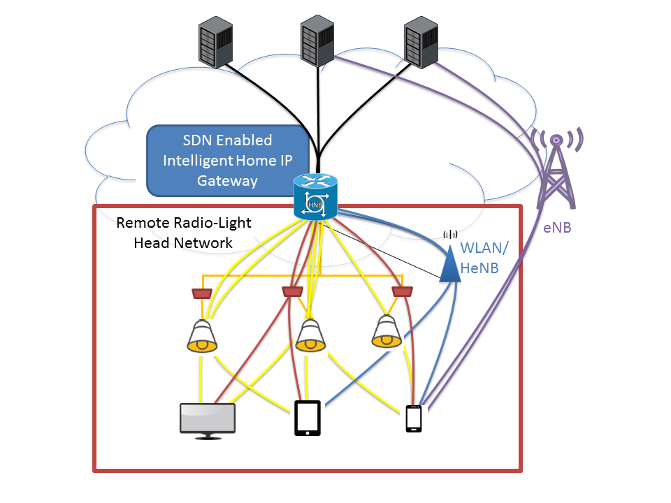 The concept of the Internet of Radio Light project is to integrate Remote Radio Heads (RRH) and Visible Light Communication (VLC) in light roses on the ceilings in indoor environments and thus provide improved connectivity and support the achievement of key 5G targets. A key aspect of our approach is to use 5G modulation and coding over VLC.