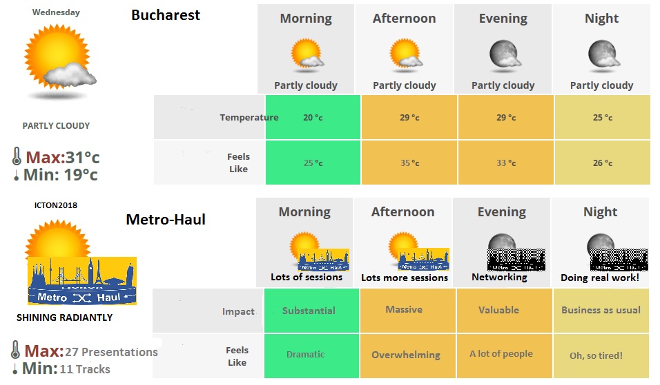 When I set out to write a short blog on the Metro-Haul activity at ICTON2018 I imagined it would be a short description of a couple of papers and presentations made by partners in Metro-Haul and a modest view of how the project is contributing to research in optical backhaul in support of 5G services. But it turns out that Metro-Haul was a huge player in the conference and I wasn’t able to attend even half of the presentations from the project: there were a total of 27 of them spread across 11 conference tracks in a 19 different sessions.