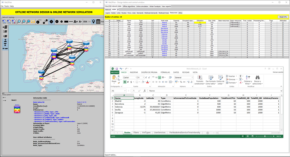 Figure 1 Net2Plan’s network visualization in the graphical user interface (GUI) and network design table