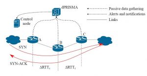 The Operation of dPRISMA is highlighted in the figure above. The red arrows represent a sample connection traversing the three monitored points of the network, distinguishing the different RTT components that are estimated to detect possible bottlenecks.
