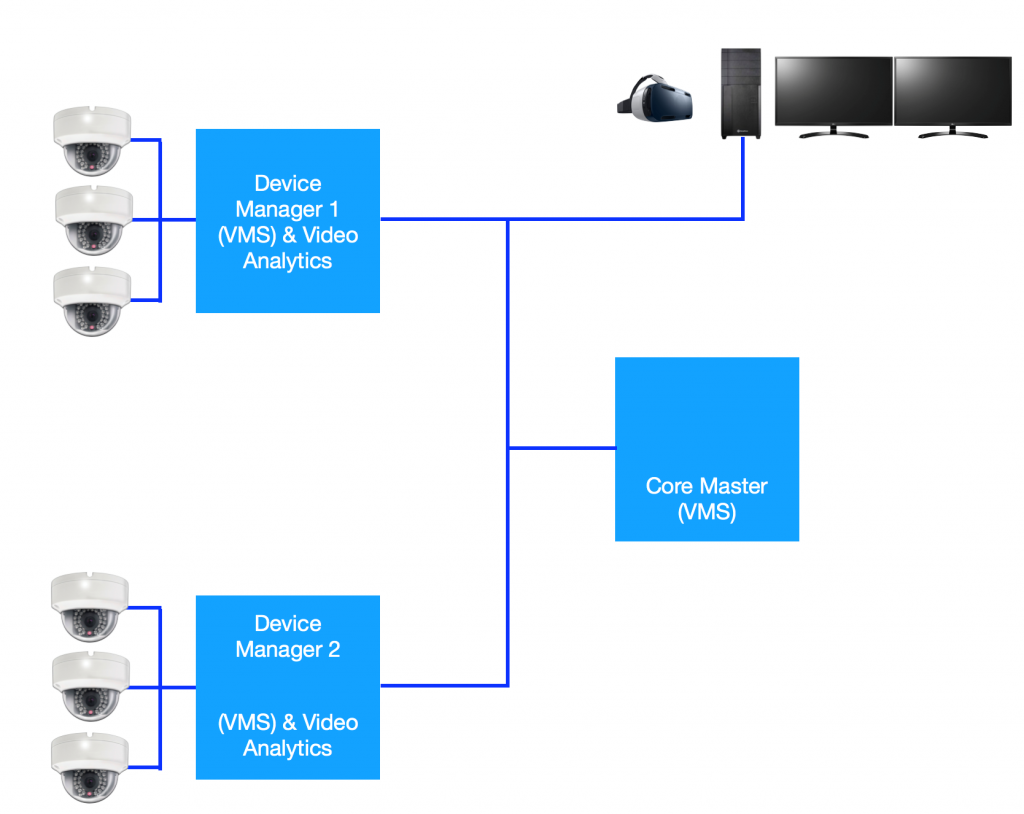 Video analytics typically include object tracking and face recognition. The number of cameras, device managers and clients is variable.