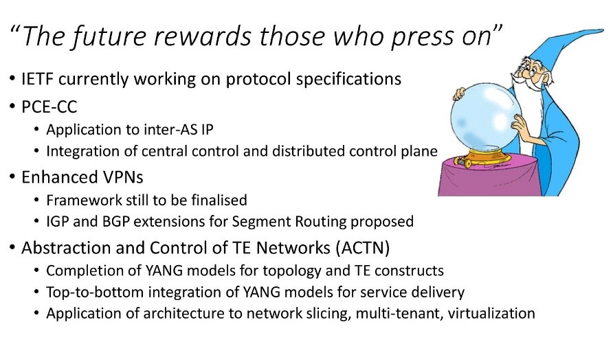 Adrian presented a very brief overview of the “Traffic Engineering Technology Evolution in the IETF.” His closing message was that the IETF has successfully developed several relevant architectures, in particular, the architecture for Abstraction and Control of TE Networks (ACTN). He said that the IETF continues to work on the development of YANG models applicable to ACTN.