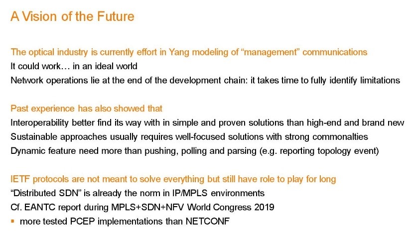 Next up was Julien Meuric, an Expert in Future Networks at Orange, and one or two network operators participating in the workshop. Julien is co-chair of the IETF’s Path Computation Element (PCE) working group and has been active in the specification of control plane technologies for optical and TE networks for many years.