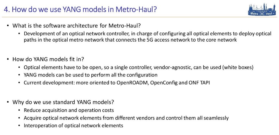 Jorge explained how YANG models have become popular as a mechanism for control and operation of optical networks, and then described where YANG models sit in the management architecture for the Metro-Haul project.