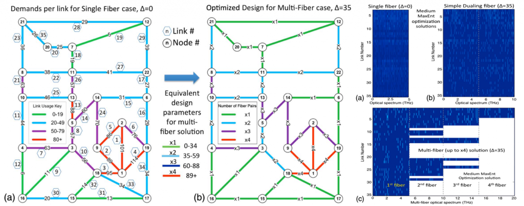A key research topic of photonic networking in IDEALIST and continuing into Metro-Haul relates to the efficient use of the optical spectrum; that is, optimising what is known as routing and spectrum assignment (RSA) to avoid fragmenting the available capacity of an optical fibre. And the best metric for understanding the fragmentation of a resource is to study its entropy. Working together with Andrew Lord (Metro-Haul’s Coordinator) and Paul Wright at BT we found that by employing Maximum Entropy (MaxEnt) techniques we could significantly improve the efficiency of an optical network and greatly expand its throughput.