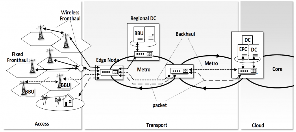 Figure 1. Metro Network Supporting RANs, with distributed DC and virtualized / pooled BBUs and EPC