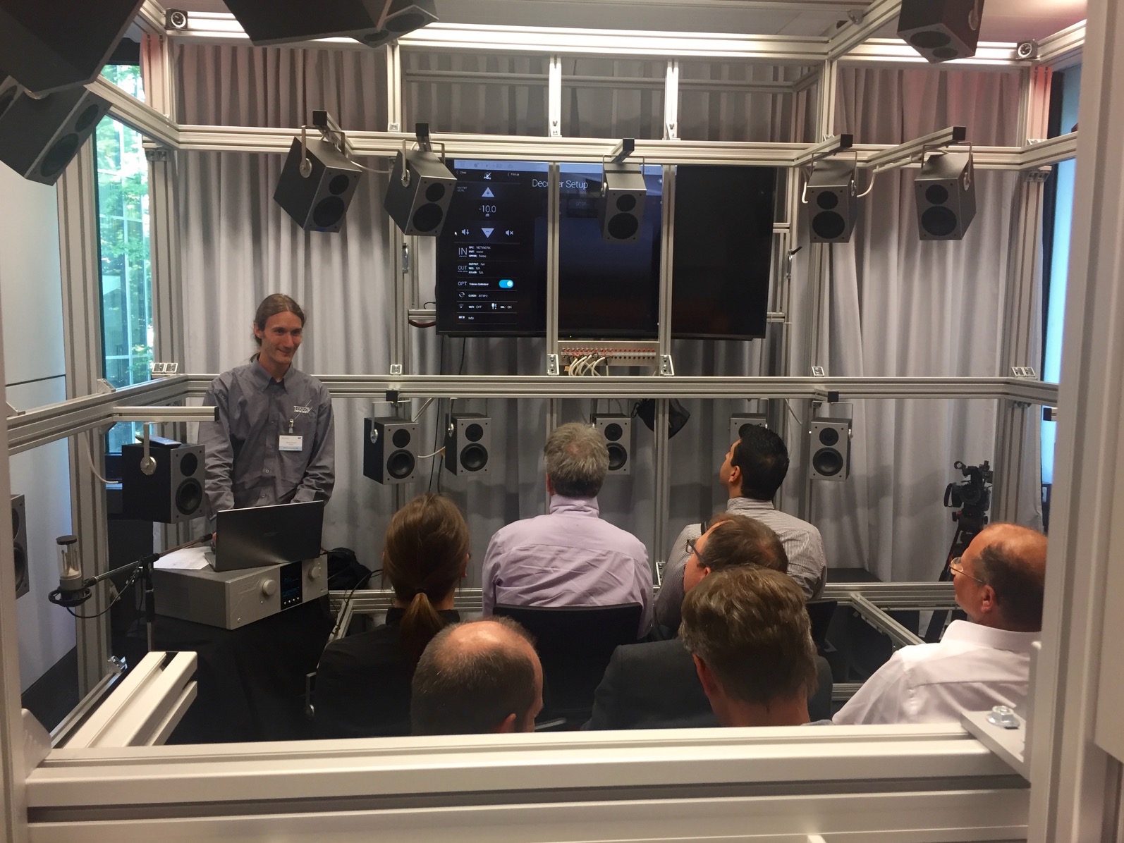 Our technical project leader Andreas Silzle from Fraunhofer IIS started with an overview on the concept and achievements of ORPHEUS made in the past 30 months. Next, Michael Weitnauer from the hosting IRT zoomed into the ORPHEUS Reference Architecture for the complete chain of object-based audio broadcasting. The audio format we have used for consumer delivery was MPEG-H, which is already on air in UHD-TV in Korea and will be introduced in China soon. Harald Fuchs from Fraunhofer IIS explained the technical details of this Next Generation Audio codec and the new functionalities it is offering to the audience.