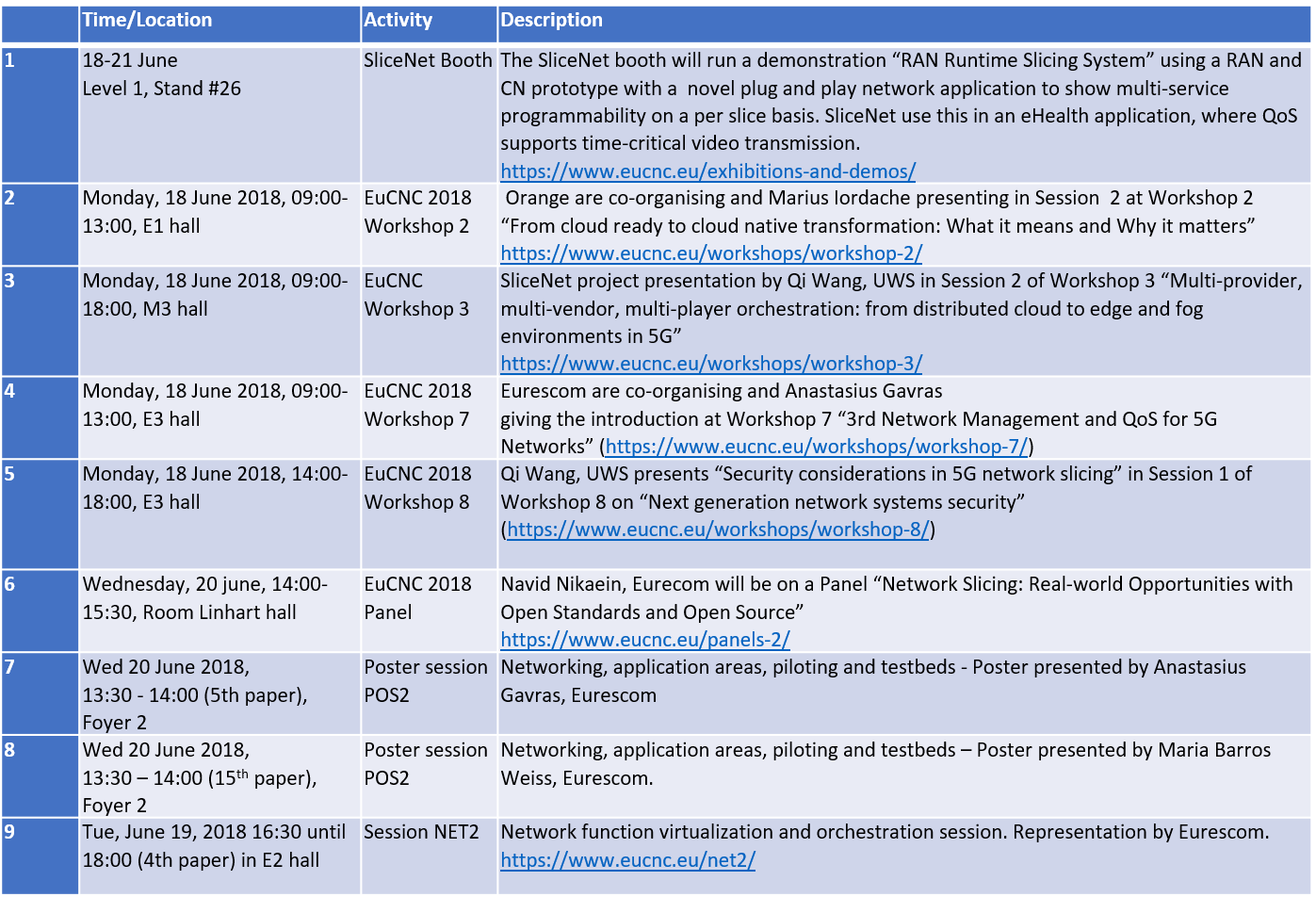 The SliceNet team are coming to EuCNC2018 in force! We have a number of activities and contributions from the project at this year’s EuCNC2018 and hope that you will come and join us. We have a booth where we will demonstrate the RAN Runtime Slicing System necessary to show the programmability of multi-service per slice. We have several workshops on 5G slicing, cloud, security, network management, poster sessions and much more. Have a look at the list of activities and come and talk to us! See full details here