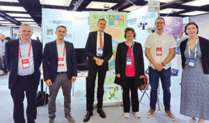 SUSTAIN-6G booth at EuCNC 2025: Panagiotis Demestichas (University Piraeus), Sokratis Barmpounakis (WINGS), Christoph Schmelz (Nokia), Chiara Mazzone (SNS JU), Antonio Sainz (QUAMPO) and Liesbet Van der Perre (KU Leuven)
