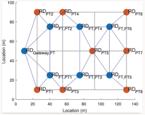 IoT Mesh solutions work focused on developing DECT-2020 NR technology further in massive IoT use cases as well as evaluating system performance with different link and system simulation models in generic massive IoT mesh architecture illustrated in Figure 2. First, an extensive study on Release 1 performance was conducted based on system and link simulation tools including comparison to 802.11ax based Wi-FI systems. It was found that DECT-2020 NR physical layer can operate in a robust manner with high spectral efficiency, low TX powers and limited device activity levels in variable environments and use cases.