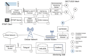 To illustrate one proof of concept (PoC) of the USWA project, specifically Energy QoS monitoring, Figure 7 presents the overall PoC architecture. The solution leverages DECT-2020 NR technology to enable modular, low-maintenance deployment of new control, monitoring, and protection components (IEDs) within substations, eliminating the need for rewiring. Furthermore, wireless mesh technologies enhance system resiliency by providing alternative communication paths. The PoC demonstrates how reliable wireless connectivity can replace wired connections while ensuring accurate transmission of energy Quality of Service (QoS) and consumption data from Circuit Monitoring Sensor (CMS) devices.
